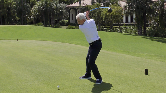 Whippy driver-length shaft drops the club into the slot on the downswing, grooving a shallow swing plane.